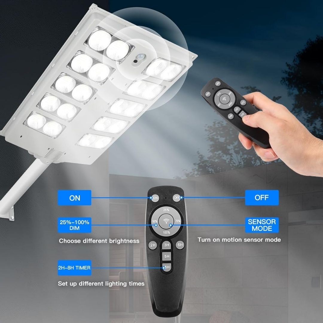 This 1000W solar street light offers a potent and sustainable way to illuminate outdoor spaces. Its integrated solar panel efficiently converts sunlight into energy, stored in a durable battery to power the bright LED lights automatically from sunset to sunrise. Built to withstand various weather conditions, these lights often come equipped with smart features like motion detection and programmable timers. Perfect for streets, parking areas, and pathways, they eliminate the need for wiring, leading to no electricity bills and an environmentally friendly lighting solution
