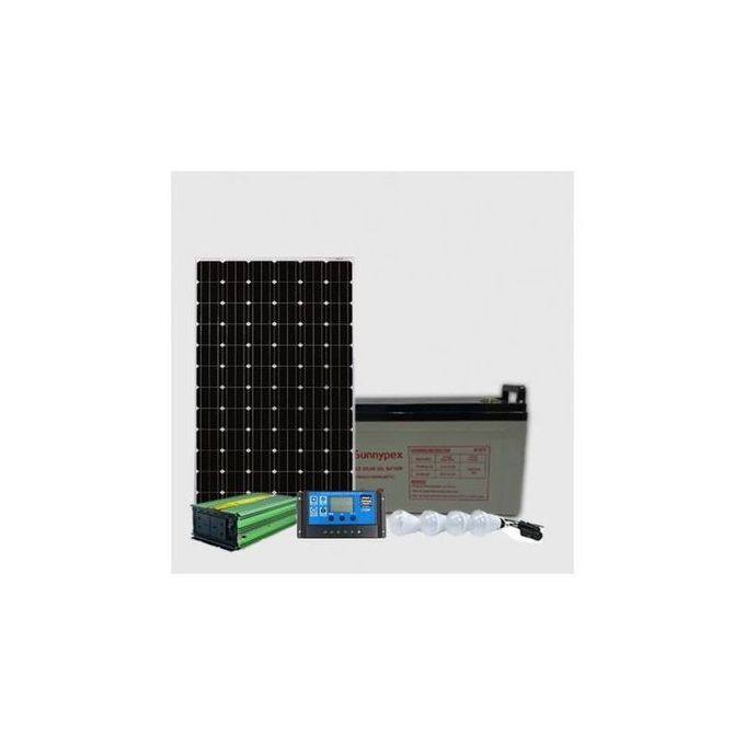 The Sunnypex Solar Fullkit 100W is a complete off-grid solar power system, integrating a 100-watt solar panel for energy generation, an 80Ah battery for storage, a 300-watt inverter for AC power conversion, a 10 amp charge controller for battery management, and four bulbs for lighting, providing a self-sufficient power solution for remote locations or backup needs.